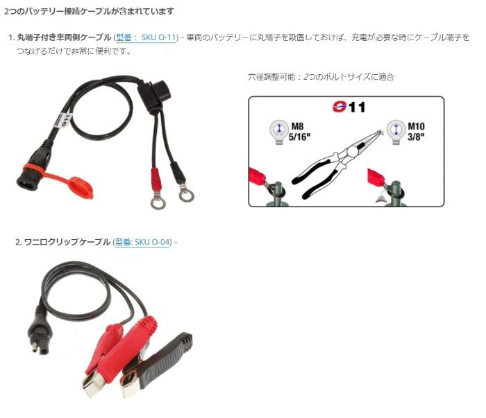 同梱物:生活防水仕様のワニ口クリップケーブル、丸端子車両側ケーブル
